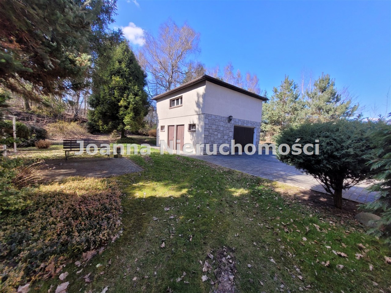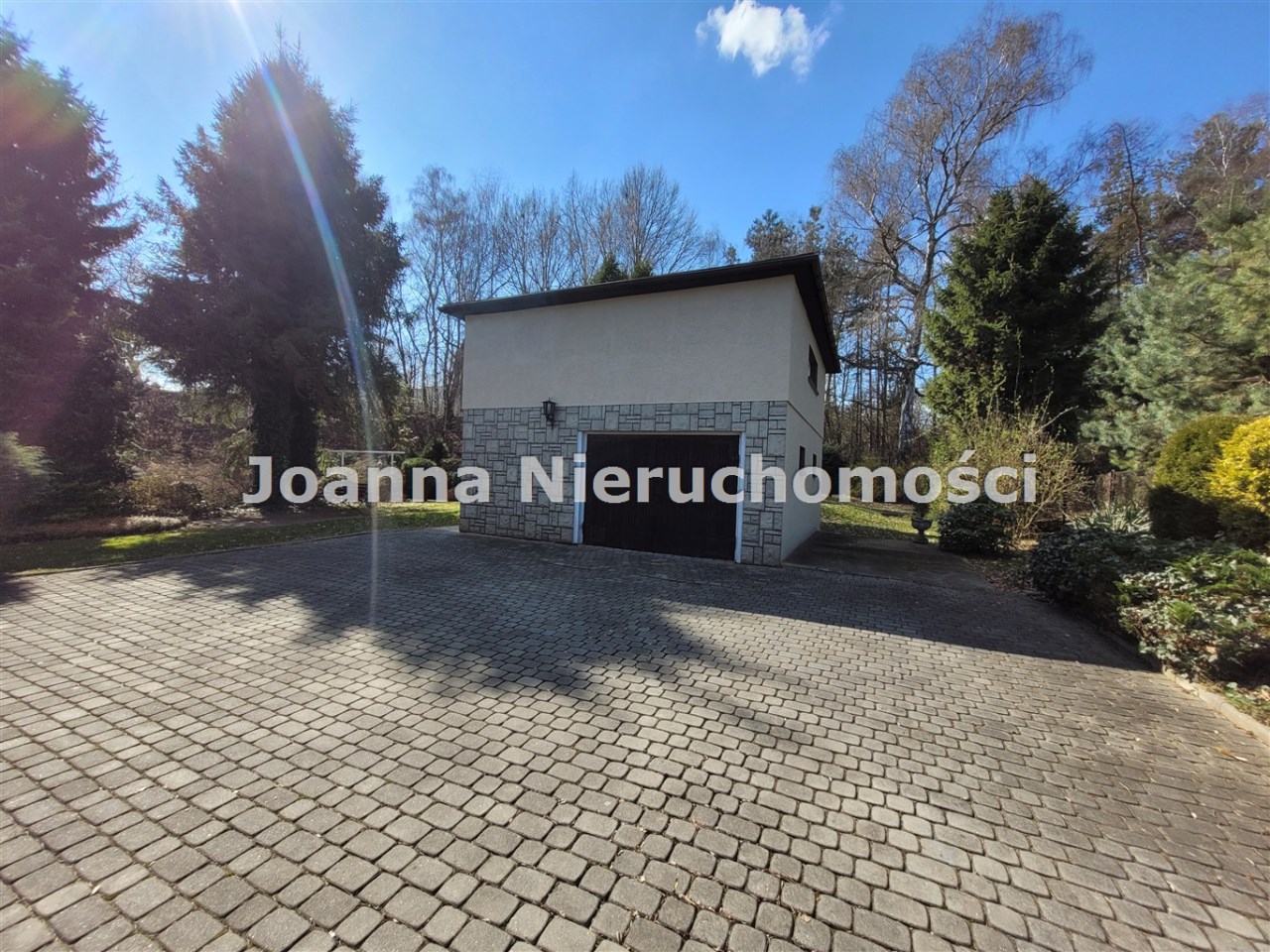 Dojazd do garażu i część działki wyłożone kostką betonową.